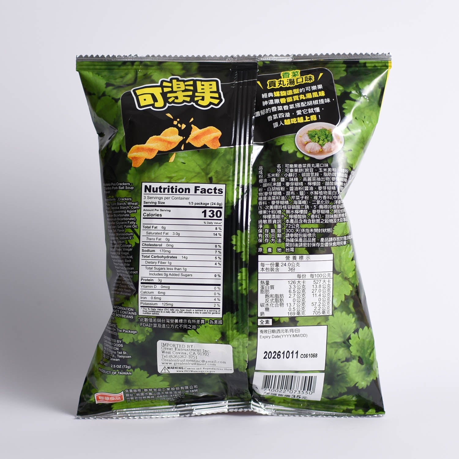 可樂果 豌豆酥-香菜貢丸湯口味 KOLOKO Pea Cracker - Vegan Cilantro Pork Ball Soup Flavor (Lian Hwa Food)